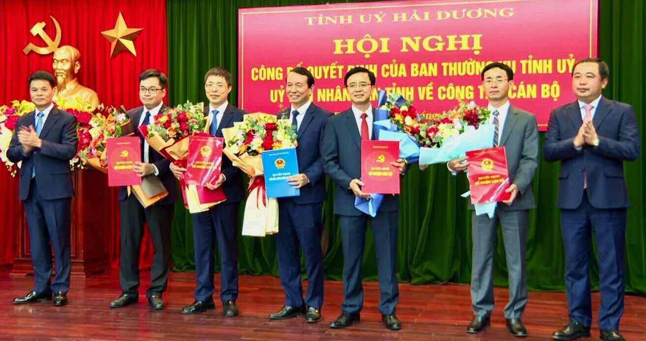 Lãnh đạo tỉnh Hải Dương trao Quyết định và tặng hoa các cán bộ được điều động, bổ nhiệm.