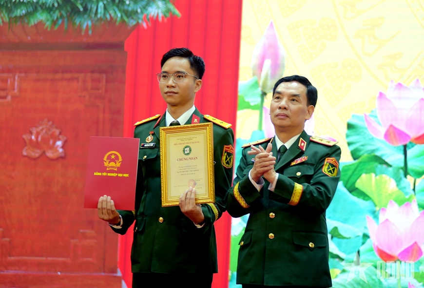Trung tướng, GS, TS Lê Minh Thái, Giám đốc Học viện Kỹ thuật Quân sự trao bằng tốt nghiệp cho thủ khoa khóa 56. |