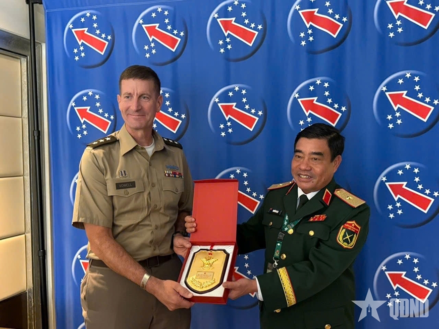 | Thiếu tướng Nguyễn Bá Lực trao quà lưu niệm tặng Trung tướng Joel Vowel, Phó tư lệnh Bộ tư lệnh Lục quân Thái Bình Dương Hoa Kỳ. |