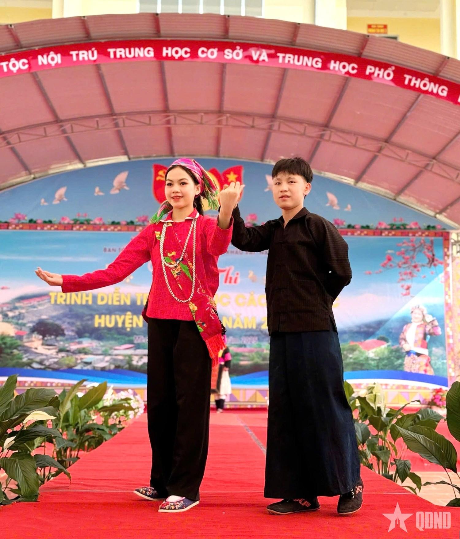 Em Hoàng Thị Luyên, lớp 8C, Trường Phổ thông Dân tộc bán trú THCS xã Giàng Chu Phìn (Mèo Vạc, Hà Giang) tham gia dự thi trang phục truyền thống dân tộc Xuồng. |