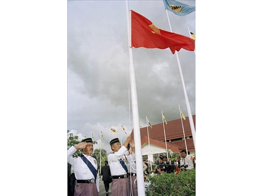 | Nghi thức thượng cờ tại lễ kết nạp Việt Nam trở thành thành viên thứ bảy của ASEAN, ngày 28-7-1995. Ảnh: TTXVN |