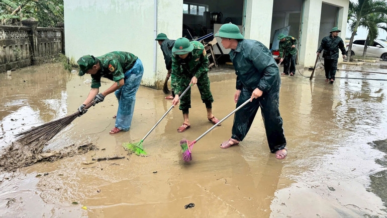 | Bộ đội Biên phòng dọn dẹp vệ sinh ở xã Hòa Xuân, tỉnh Đắk Lắk sau mưa lũ. Ảnh: nhandan.vn |
