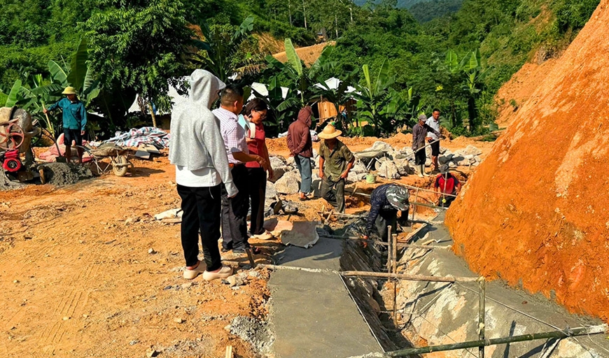 | Lãnh đạo xã Lý Bôn (tỉnh Cao Bằng) kiểm tra tiến độ thực hiện một số công trình đường giao thông trên địa bàn xã. |