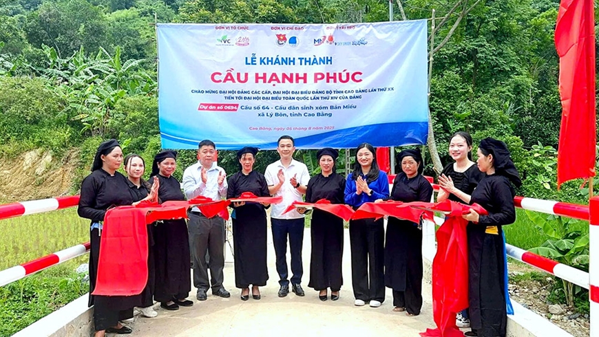 Lễ khánh thành công trình “Cầu hạnh phúc” tại xóm Bản Miều, xã Lý Bôn (tỉnh Cao Bằng) chào mừng đại hội đảng các cấp. Ảnh: DƯƠNG LAN |
