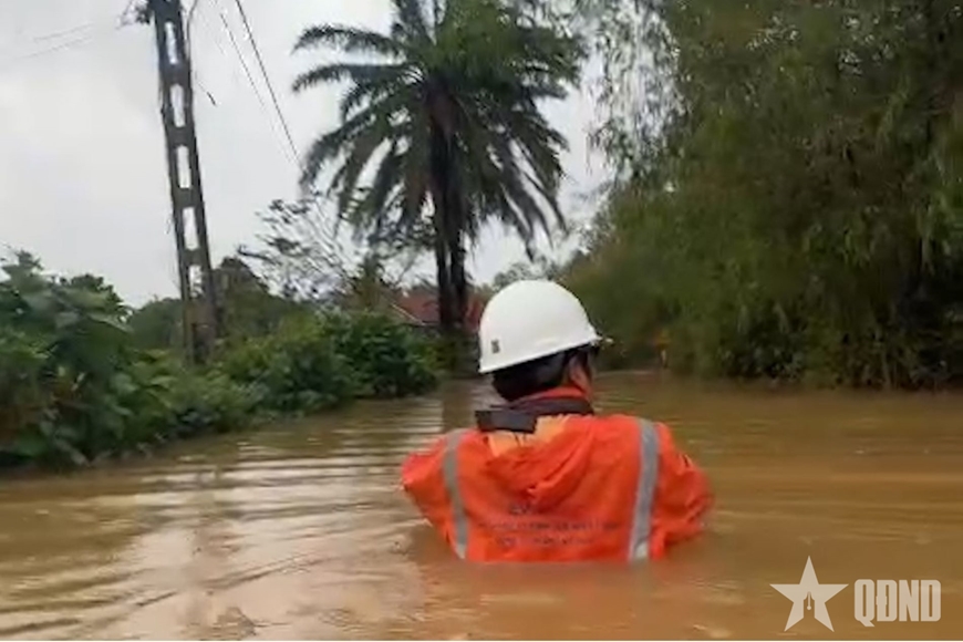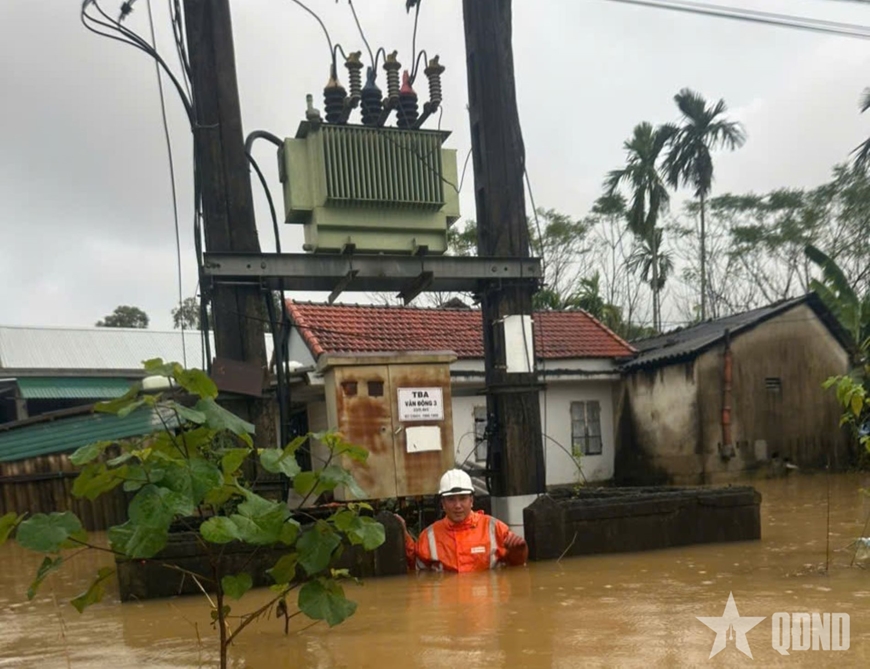 Nhân viên điện lực miền Trung tiếp cận trạm biến áp đang ngập nước để kiểm tra, bảo đảm an toàn cấp điện. |