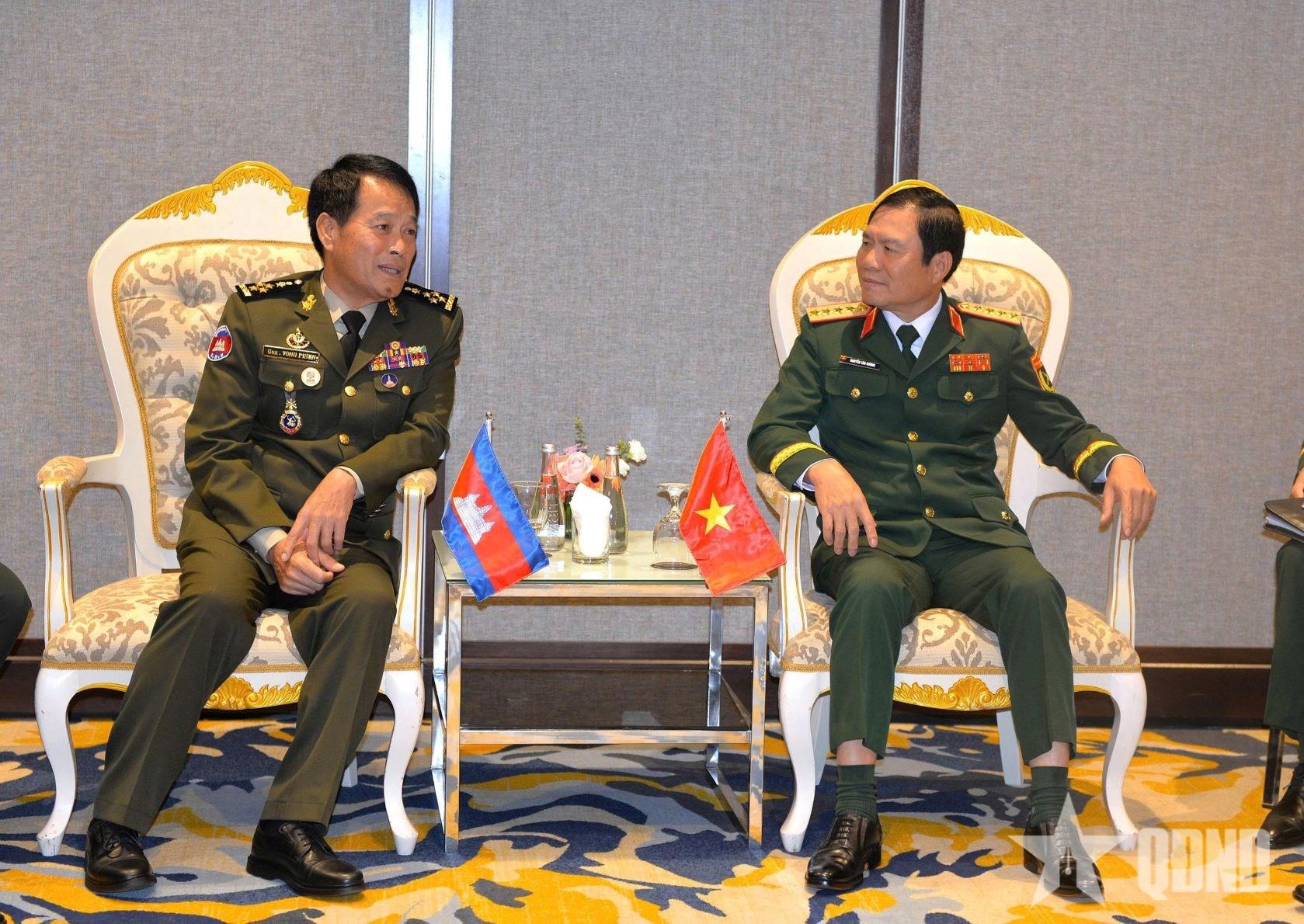 Đại tướng Nguyễn Tân Cương gặp song phương với Đại tướng Vong Pisen, Tổng Tư lệnh Quân đội Hoàng gia Campuchia. |