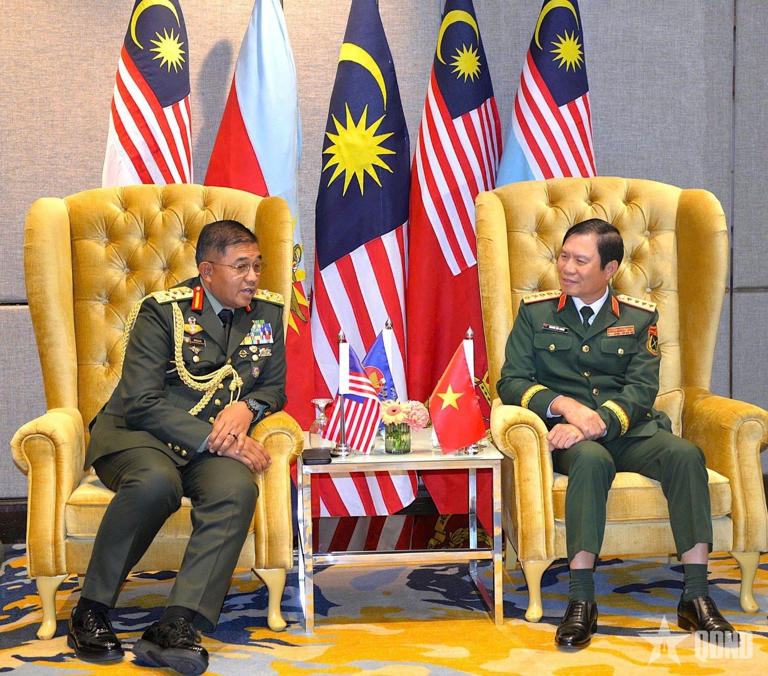 Đại tướng Nguyễn Tân Cương trao đổi với Đại tướng Tan Sri Hj Mohd Nizam bin Hj Jaffar, Tư lệnh Lực lượng Quốc phòng Malaysia. |