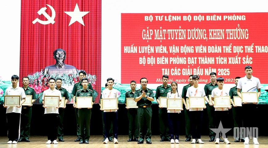 | Trung tướng Lê Đức Thái, Ủy viên Trung ương Đảng, Tư lệnh Bộ đội Biên phòng khen thưởng các huấn luyện viên, vận động viên xuất sắc. Ảnh: HỮU TRƯỞNG |