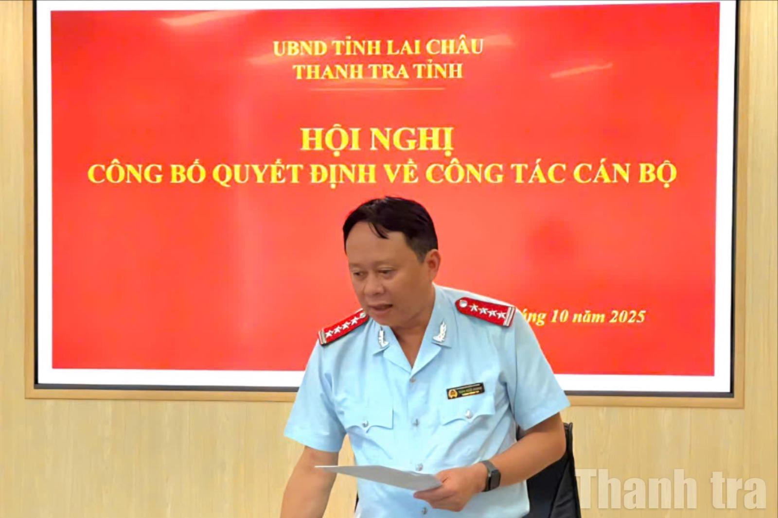 Thực hiện chủ trương của Tỉnh ủy và UBND tỉnh Lai Châu về công tác tổ chức, cán bộ, thời gian qua, Thanh tra tỉnh Lai Châu đã tổ chức công bố các quyết định điều động, bổ nhiệm cán bộ lãnh đạo, quản lý tại một số phòng chuyên môn.