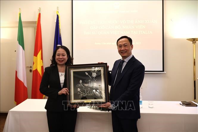 | Phó chủ tịch nước Võ Thị Ánh Xuân tặng quà lưu niệm cho Đại sứ quán Việt Nam tại Italy. |