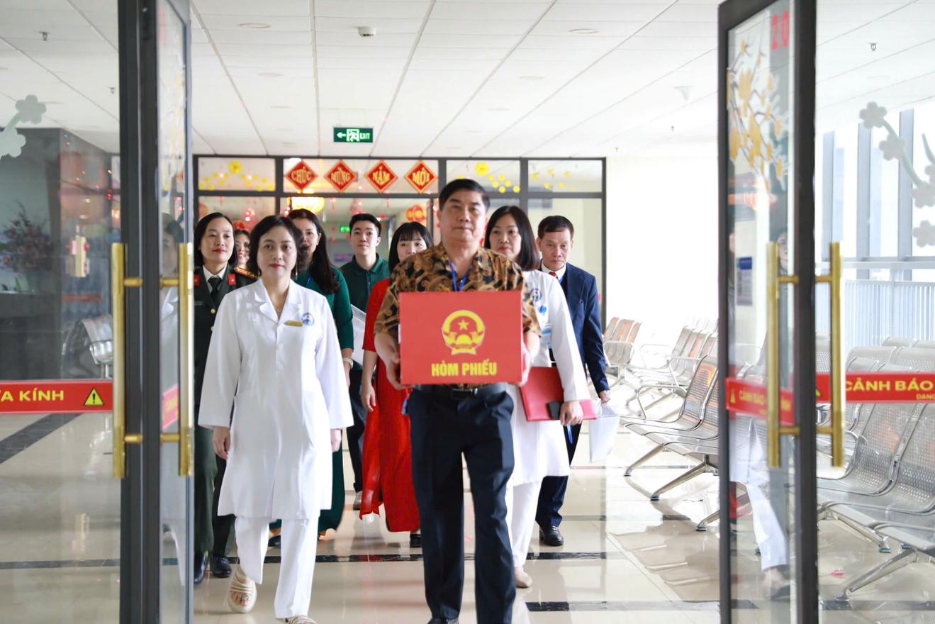 Hòm phiếu phụ do thành viên Tổ Bầu cử số 35, khu vực bỏ phiếu số 35, phường Vĩnh Phúc trực tiếp mang tới Bệnh viện Đa khoa Vĩnh Phúc. Ảnh: Cổng TTĐT tỉnh Phú Thọ