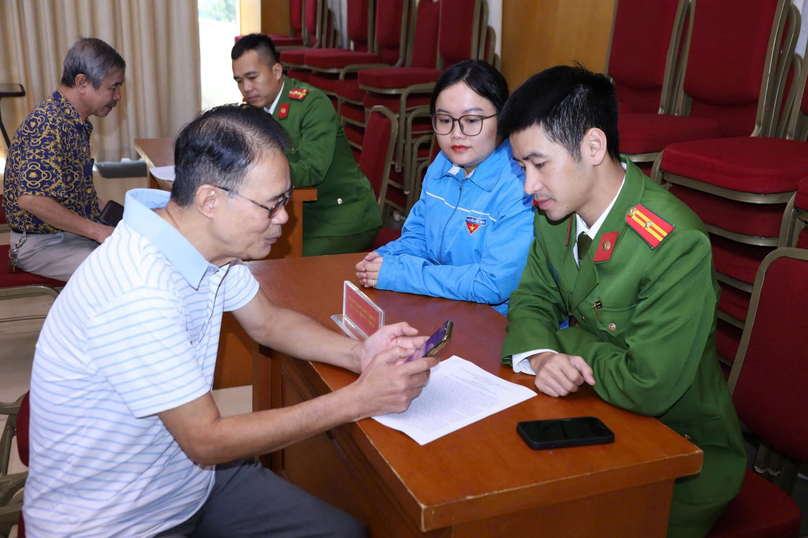 Công an phường hướng dẫn Nhân dân tham gia góp ý dự thảo các văn kiện trình Đại hội XIV của Đảng thông qua ứng dụng VneID. Ảnh: PT