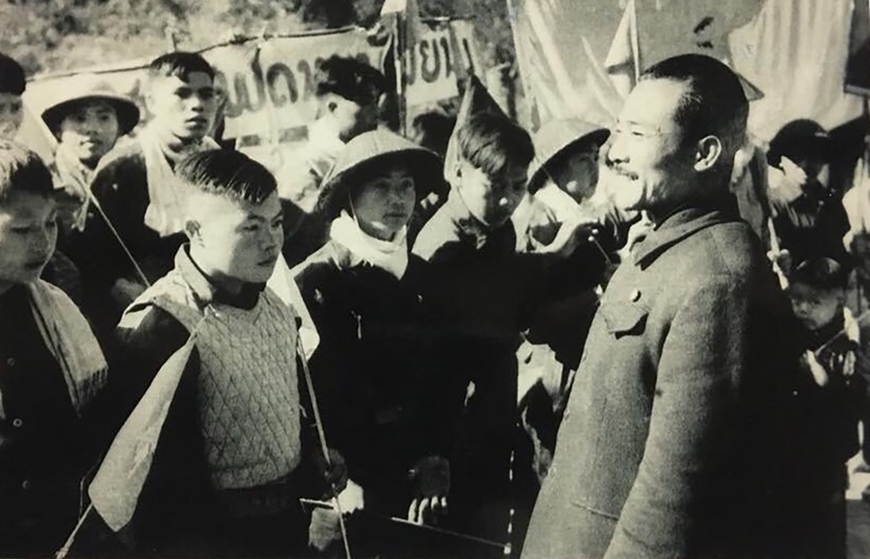 | Hoàng thân Souphanouvong nói chuyện với các chiến sĩ Quân tình nguyện Việt Nam tại Lào, năm 1950. Ảnh tư liệu |