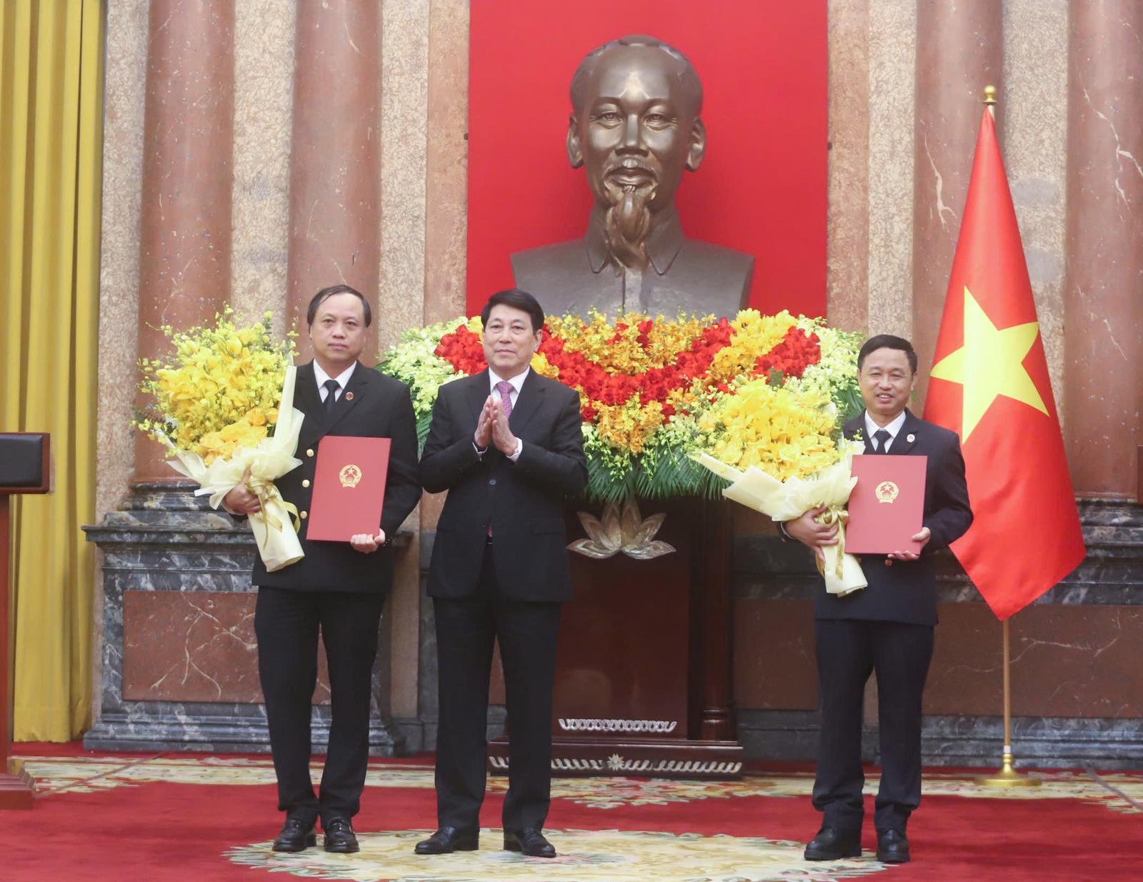 Chủ tịch nước Lương Cường trao quyết định bổ nhiệm Phó Chánh án TAND Tối cao với ông Lê Tiến và ông Nguyễn Biên Thùy. Ảnh: Đ.X