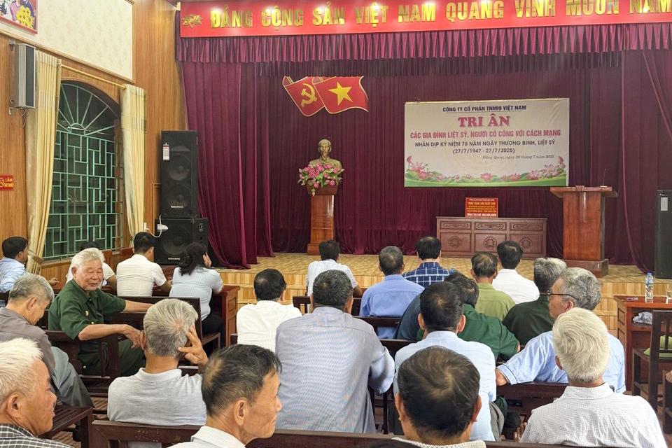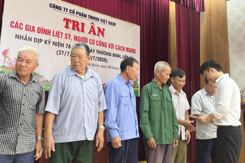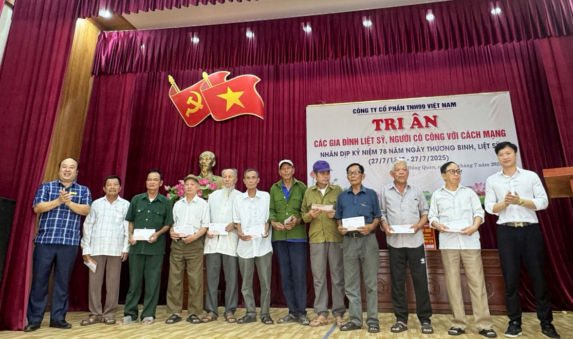 Trong không khí trang nghiêm và đầy xúc động nhân dịp kỷ niệm 78 năm Ngày Thương binh - Liệt sỹ, Công ty cổ phần TNH99 Việt Nam phối hợp cùng UBND xã Đông Quan (tỉnh Hưng Yên) đã tổ chức chương trình trao quà tri ân các thương binh, bệnh binh, thân nhân liệt sỹ và người có công với cách mạng trên địa bàn xã.