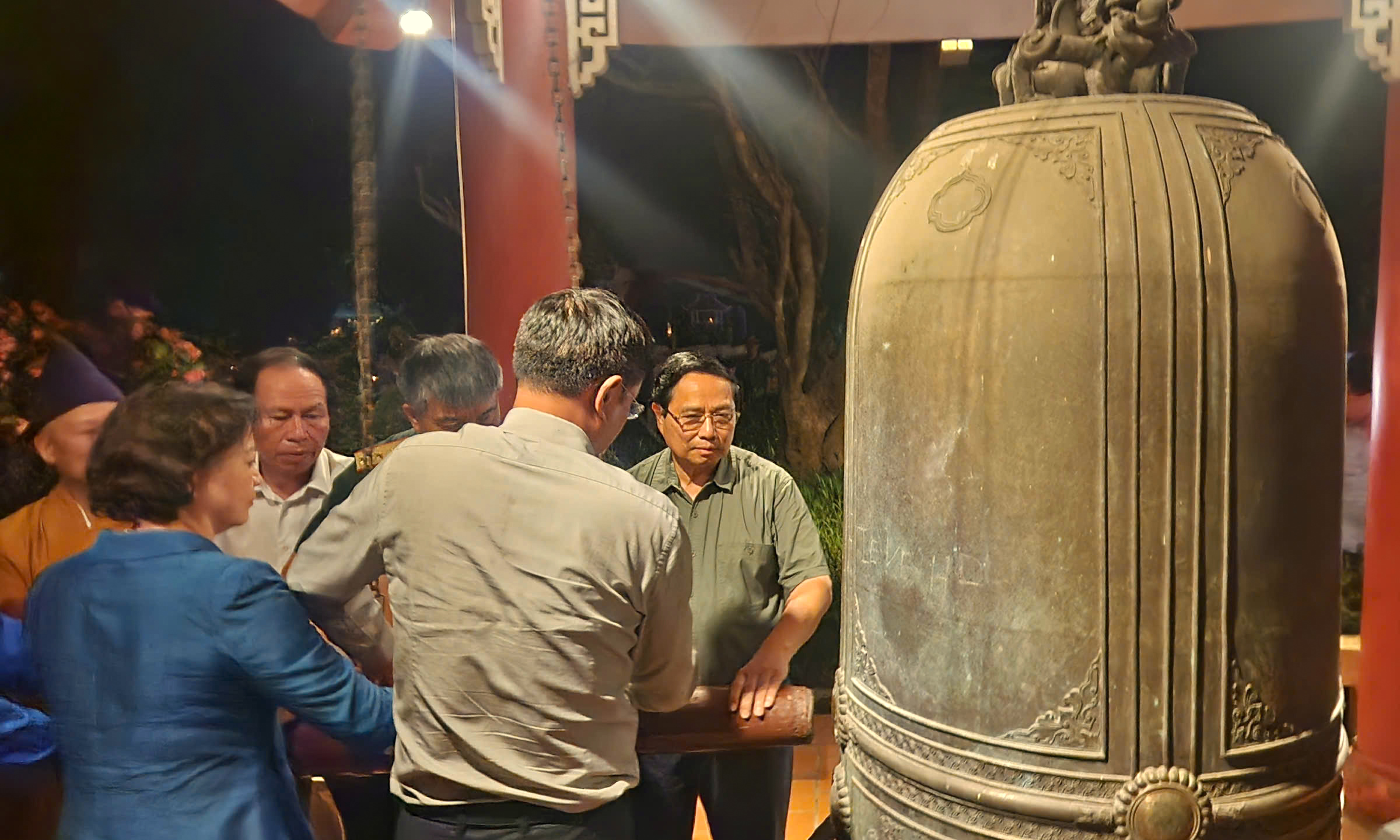 Thủ tướng Phạm Minh Chính và các đại biểu thực hiện nghi thức thỉnh chuông tại Nghĩa trang liệt sĩ Quốc gia Trường Sơn. Ảnh: Minh Tân
