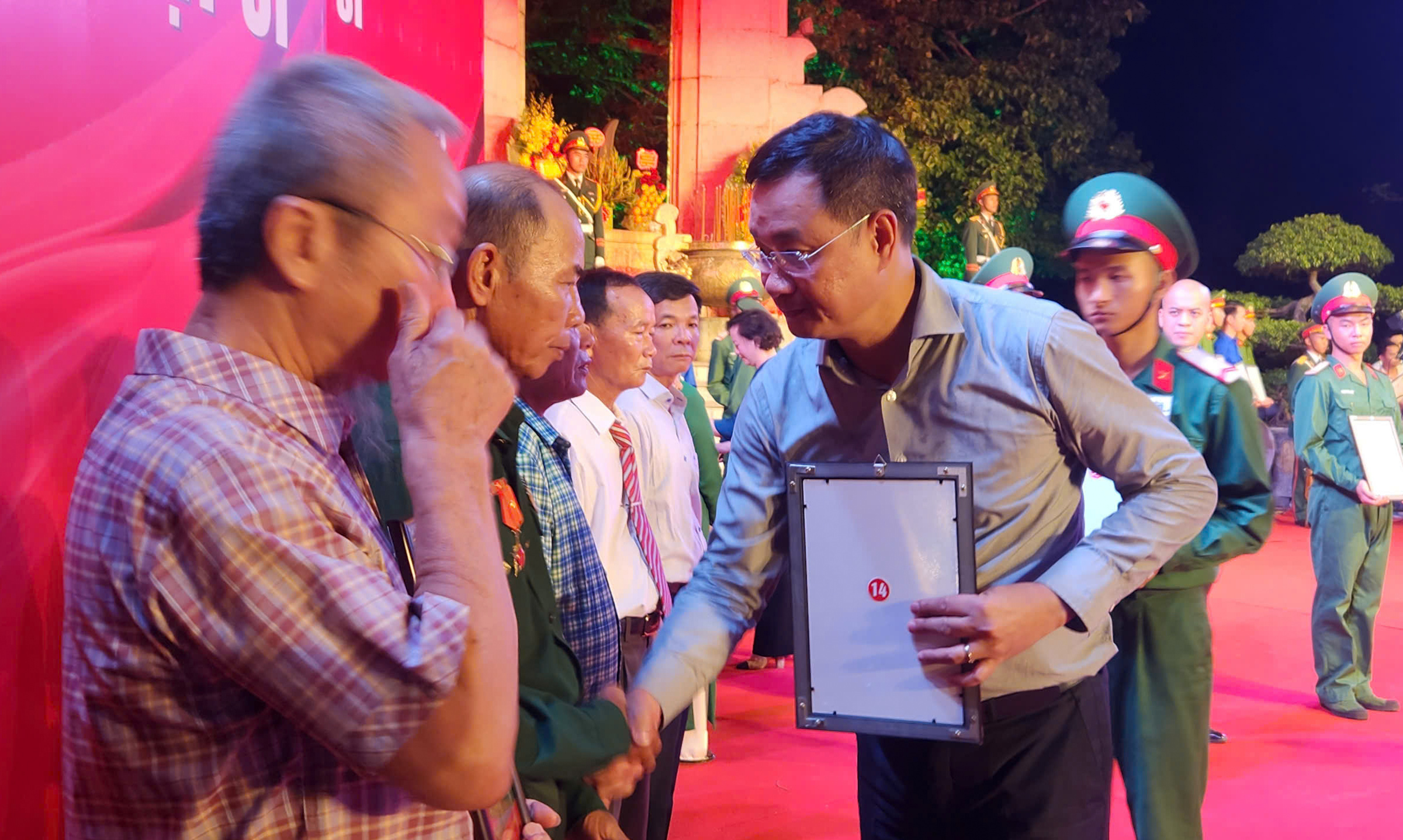 Bí thư Tỉnh ủy Quảng Trị Lê Ngọc Quang trao di ảnh các liệt sĩ được phục dựng bằng công nghệ AI cho gia đình thân nhân các liệt sĩ. Ảnh: Minh Tân