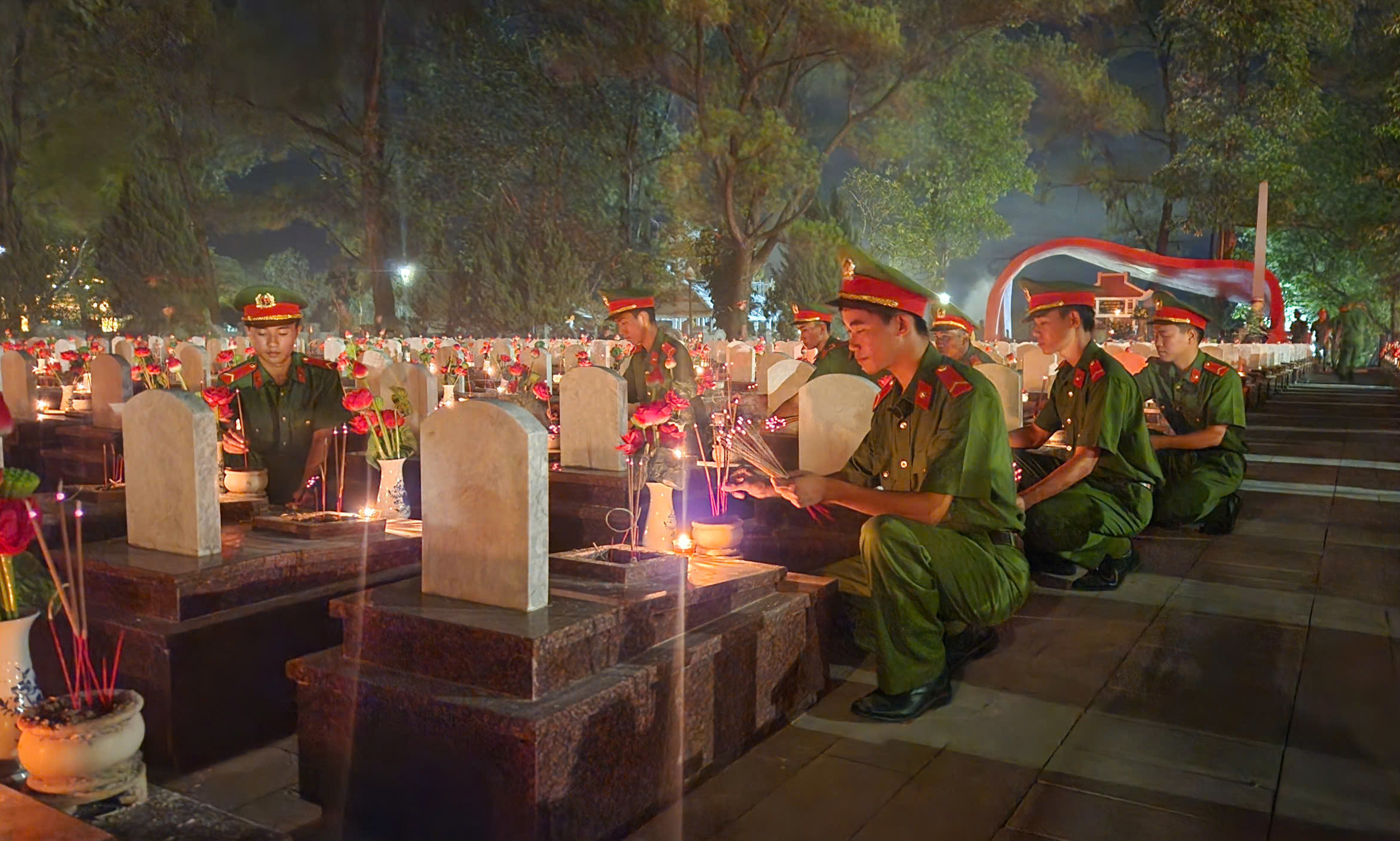 Thế hệ trẻ Công an tỉnh Quảng Trị thắp nến, dâng hương tri ân các anh hùng liệt sĩ. Ảnh: Minh Tân