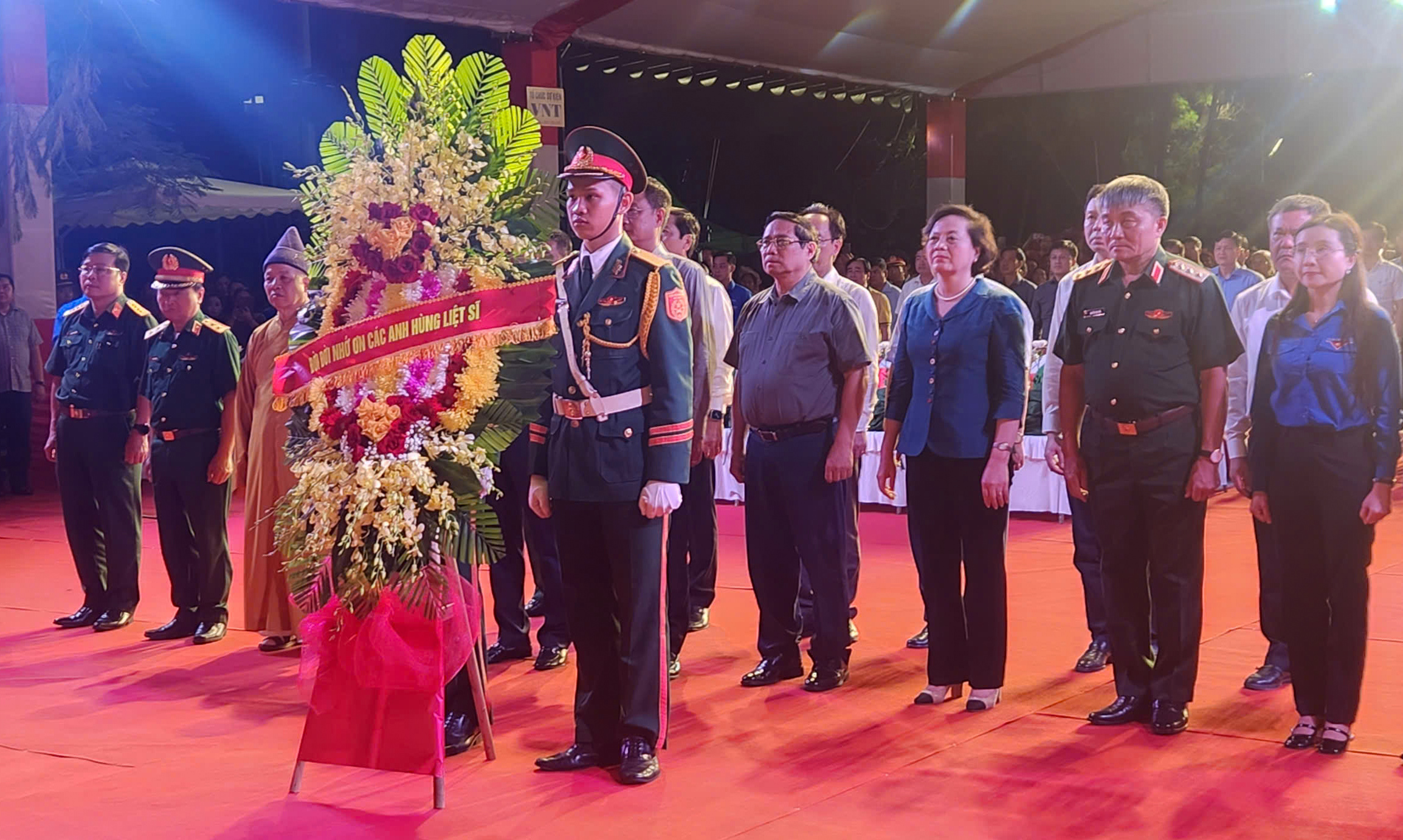 Trong không khí thiêng liêng, thành kính, trang nghiêm, xúc động tại Nghĩa trang Liệt sĩ quốc gia Trường Sơn - nơi yên nghỉ của những anh hùng liệt sĩ, Thủ tướng Phạm Minh Chính và các đại biểu đã dành phút mặc niệm; thực hiện nghi thức dâng hương, dâng hoa và thắp nến tri ân tại phần mộ các anh hùng liệt sĩ.