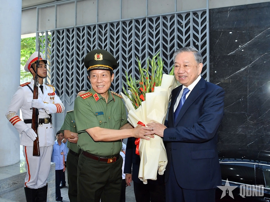 | Lãnh đạo Bộ Công an đón tiếp Tổng Bí thư Tô Lâm. |