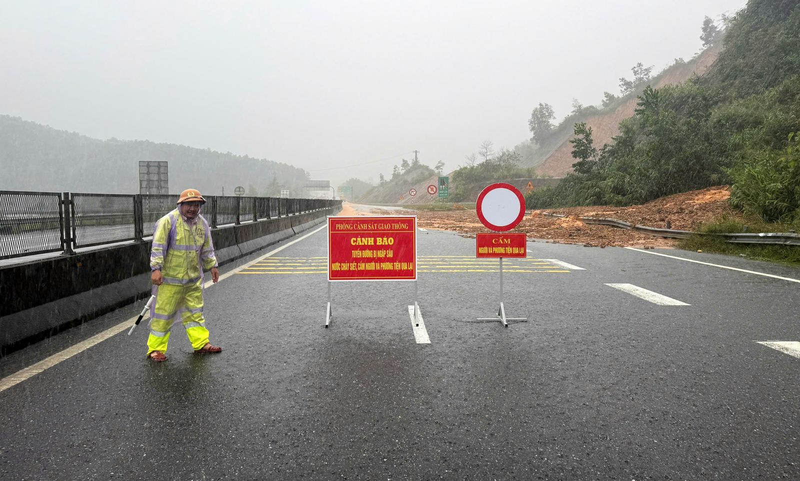 Lực lượng Cảnh sát giao thông Công an TP Huế chốt chặn tại một điểm sạt lở trên tuyến cao tốc La Sơn - Túy Loan. Ảnh: CATP Huế