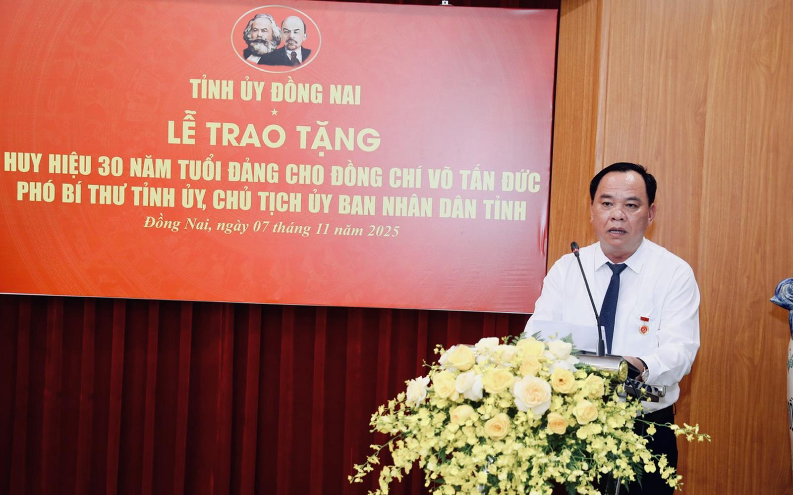 Ban Thường vụ Tỉnh ủy Đồng Nai vừa tổ chức Lễ trao tặng Huy hiệu 30 năm tuổi Đảng cho Phó Bí thư Tỉnh ủy, Chủ tịch UBND tỉnh Đồng Nai Võ Tấn Đức. Sự kiện diễn ra trang trọng, thể hiện sự trân trọng của Đảng bộ tỉnh đối với quá trình rèn luyện, cống hiến và trưởng thành của người đứng đầu chính quyền tỉnh, một đảng viên gắn bó hơn ba thập kỷ với lý tưởng phụng sự Tổ quốc và Nhân dân.