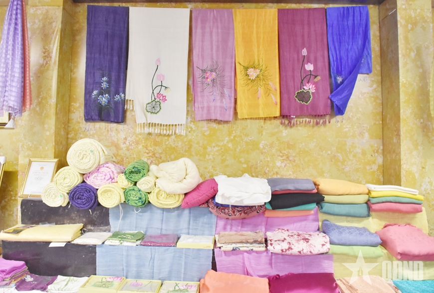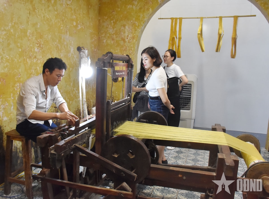 Cũng trong gian trưng bày, Làng nghề dệt lụa Phùng Xá (nay thuộc xã Tây Phương, Hà Nội) cũng ghi dấu ấn mạnh mẽ tại triển lãm. Khung cửi gỗ truyền thống kêu lạch cạch vang lên giữa không gian triển lãm như đưa người xem trở về quá khứ.