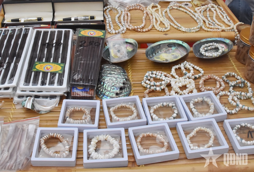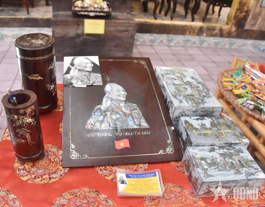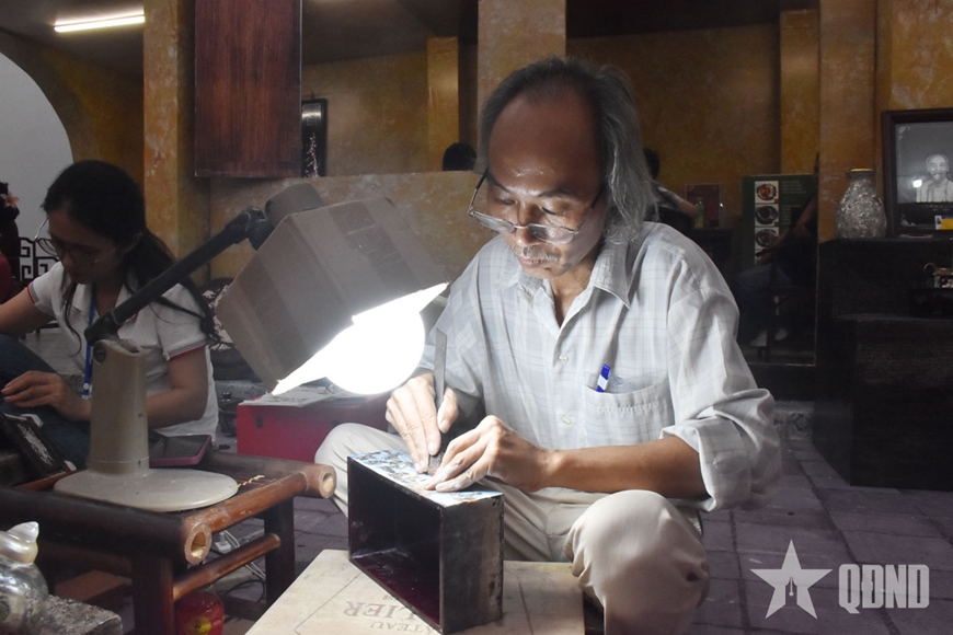 Tại đây, nghệ nhân Nguyễn Xuân Dũng, một người đã có gần 50 năm gắn bó với nghề, không chỉ trưng bày sản phẩm mà còn trực tiếp trình diễn kỹ thuật chọn vỏ trai, cắt, mài và gắn lên bề mặt gỗ.