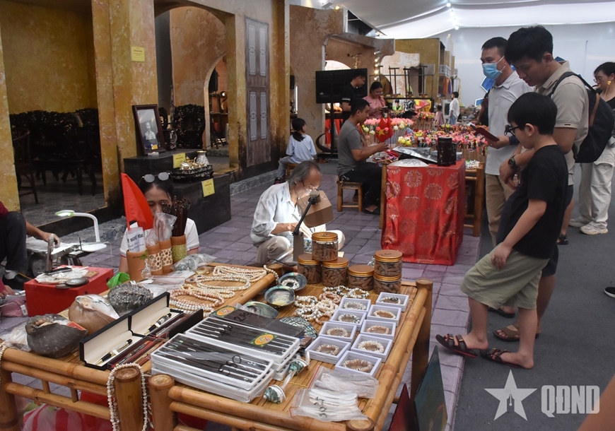 Tại "Không gian Truyền thống và Sáng tạo Hà Nội 2025", Làng nghề khảm trai Chuyên Mỹ (Chuyên Mỹ, Hà Nội) thu hút sự chú ý đặc biệt của đông đảo bạn trẻ và du khách. Những tác phẩm khảm trai được trưng bày không chỉ thể hiện vẻ đẹp lấp lánh của vỏ sò, vỏ ốc mà còn khắc họa tinh tế những biểu tượng văn hóa Hà Nội.