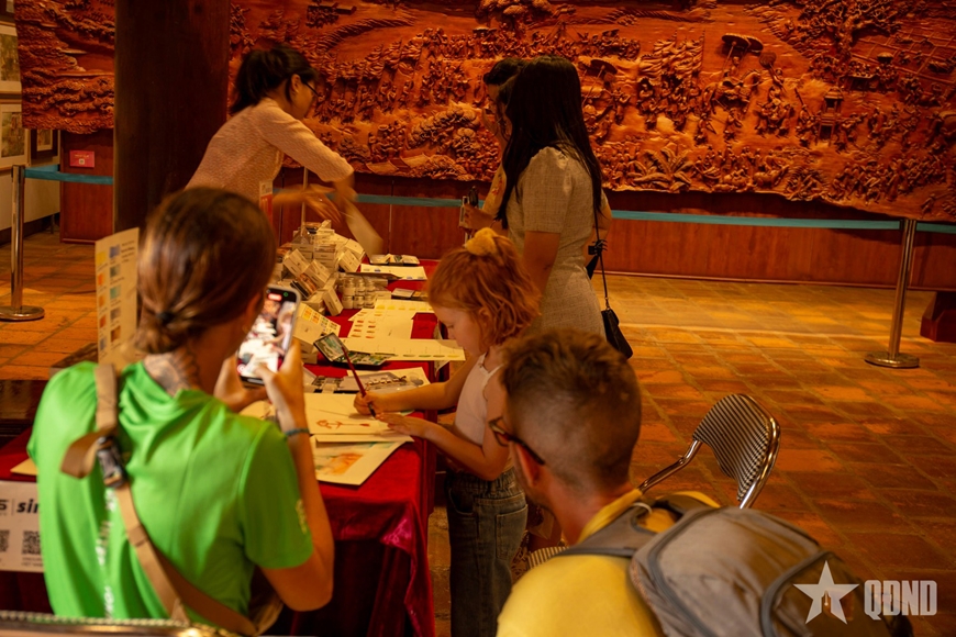 Bên cạnh việc chiêm ngưỡng các tác phẩm, khách tham quan còn có cơ hội trải nghiệm nhiều hoạt động tương tác thú vị khác như xem trình diễn vẽ demo, tham gia vẽ tranh dài, và các workshop như “Vẽ nón truyền thống”, “Họa dó”, “Ghép hình và in độc bản”.