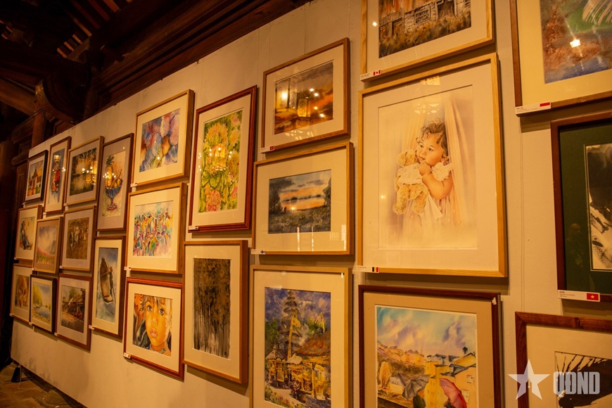 Các bức tranh được trưng bày tại Triển lãm tranh màu nước quốc tế “Hành trình kết nối”. |
