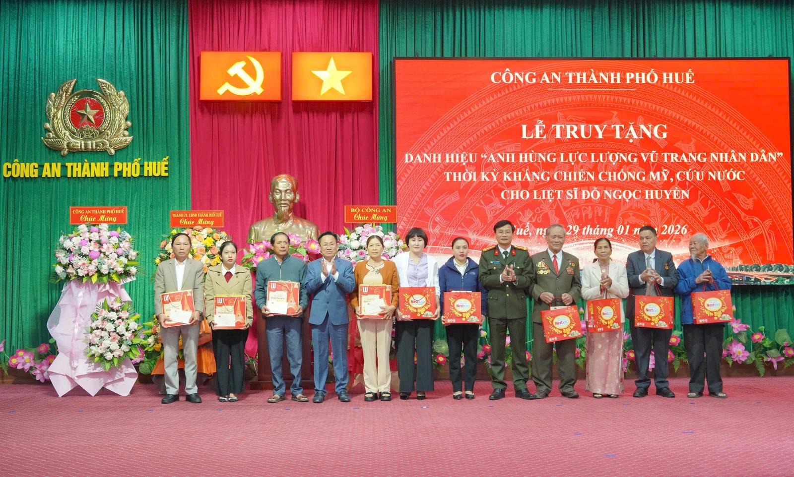 Nhân dịp này, Công an TP Huế cùng gia đình liệt sĩ Đỗ Ngọc Huyền đã gửi tặng 10 suất quà tới các Anh hùng lực lượng vũ trang nhân dân, thân nhân liệt sĩ và Mẹ Việt Nam anh hùng trên địa bàn TP Huế.