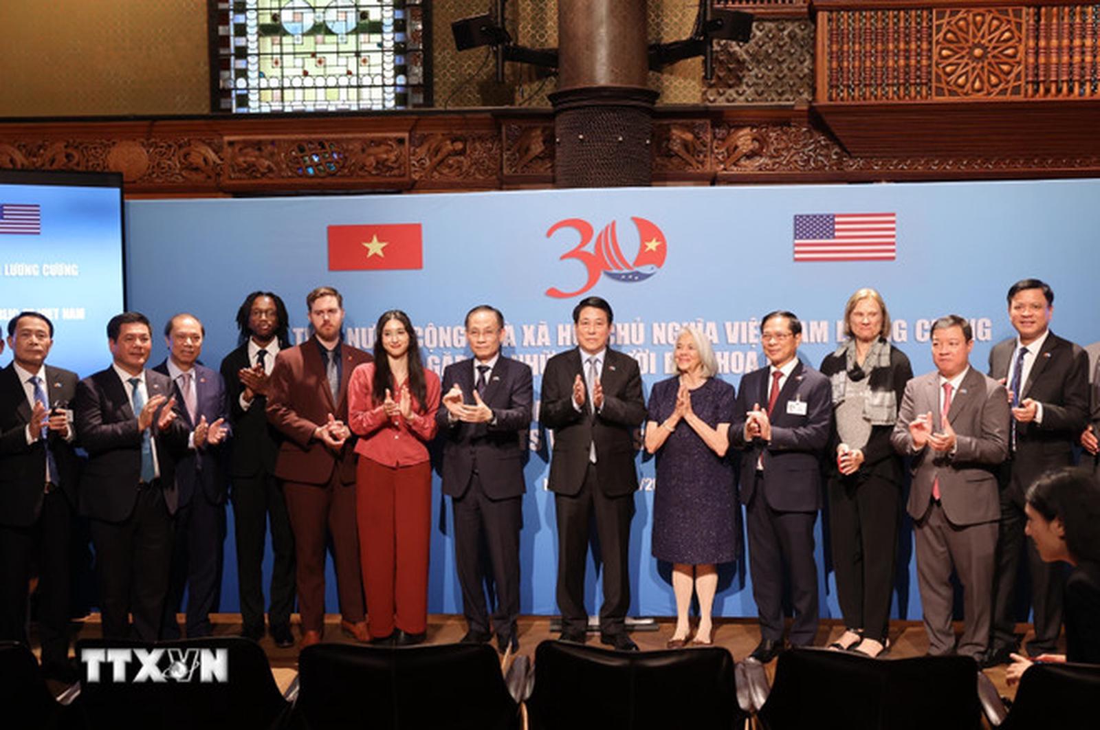 Với tinh thần “Gác lại quá khứ, vượt qua khác biệt, hướng tới tương lai” qua 30 năm thiết lập quan hệ ngoại giao, Chủ tịch nước cho biết quan hệ hai nước Việt Nam - Hoa Kỳ đã có những bước phát triển vượt bậc, Việt Nam trở thành đối tác thương mại quan trọng của Hoa Kỳ.