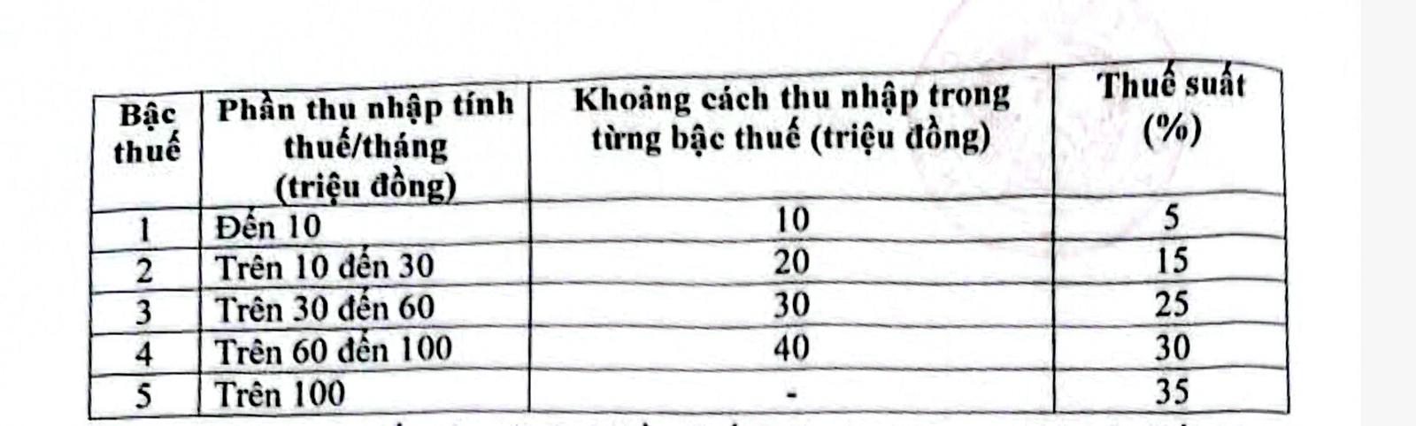 Về Biểu thuế lũy tiến từng phần, Biểu thuế hiện hành gồm 7 bậc, thuế suất từ 5% đến 35%.