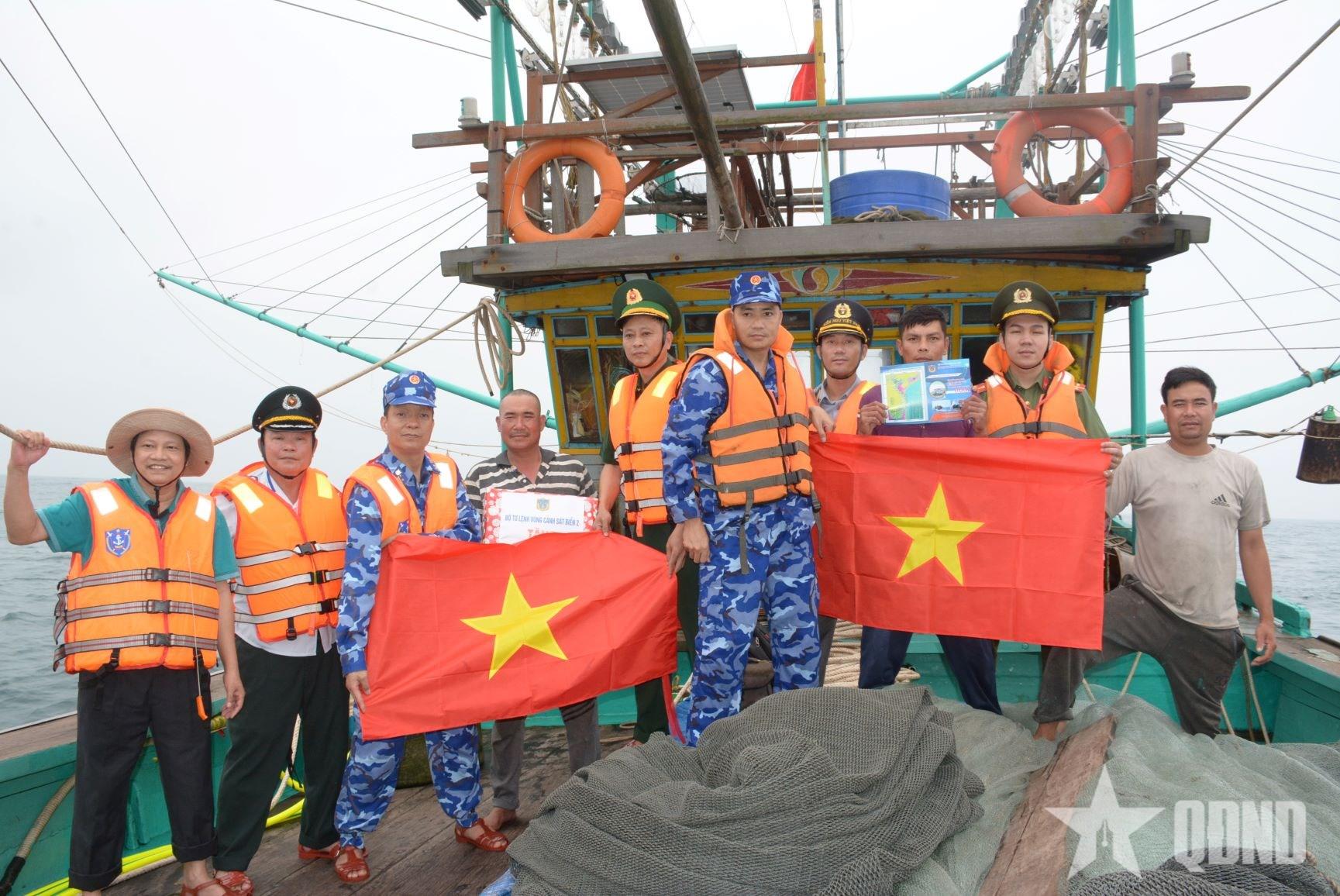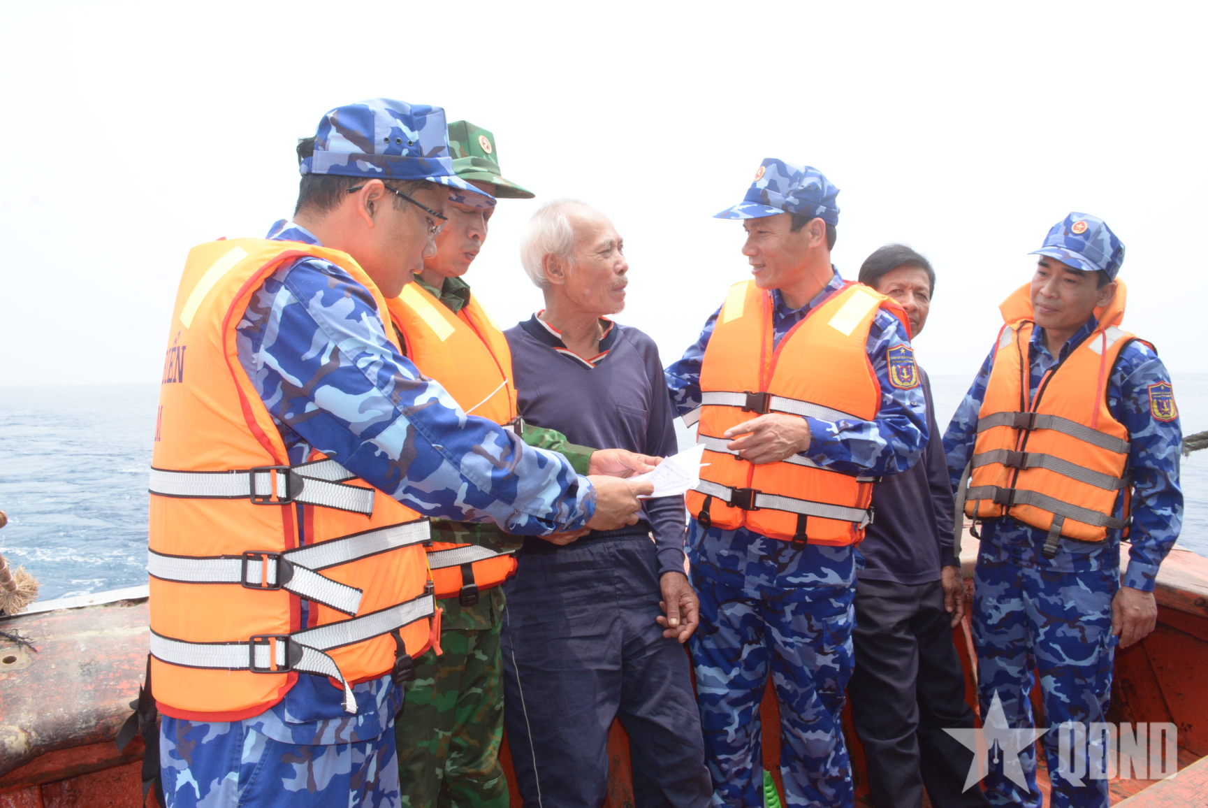 Cán bộ, chiến sĩ Vùng Cảnh sát biển 2 (Cảnh sát biển Việt Nam) tặng quà và tuyên truyền, phổ biến pháp luật cho ngư dân trên vùng biển Quảng Trị. |