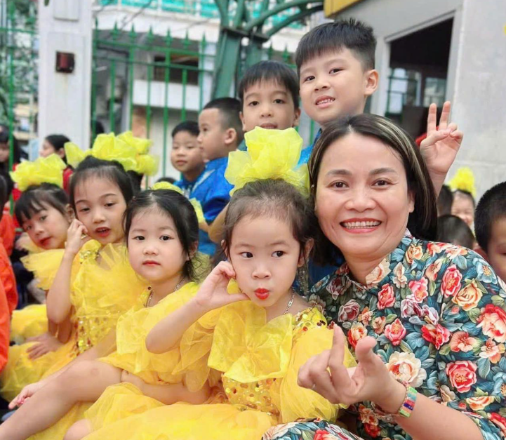 Cô Giao Linh, giáo viên Trường Mẫu giáo số 9, phường Ngọc Hà (Hà Nội) chụp ảnh cùng các học sinh. Ảnh: NVCC