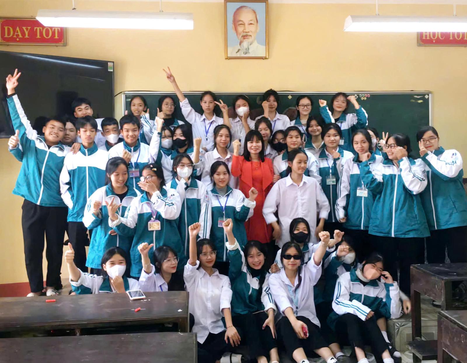 Cô Lương Thanh Thủy, giáo viên Trường THPT Hoàng Văn Thụ (Ninh Bình) chụp ảnh lưu niệm cùng học sinh. Ảnh: NVCC